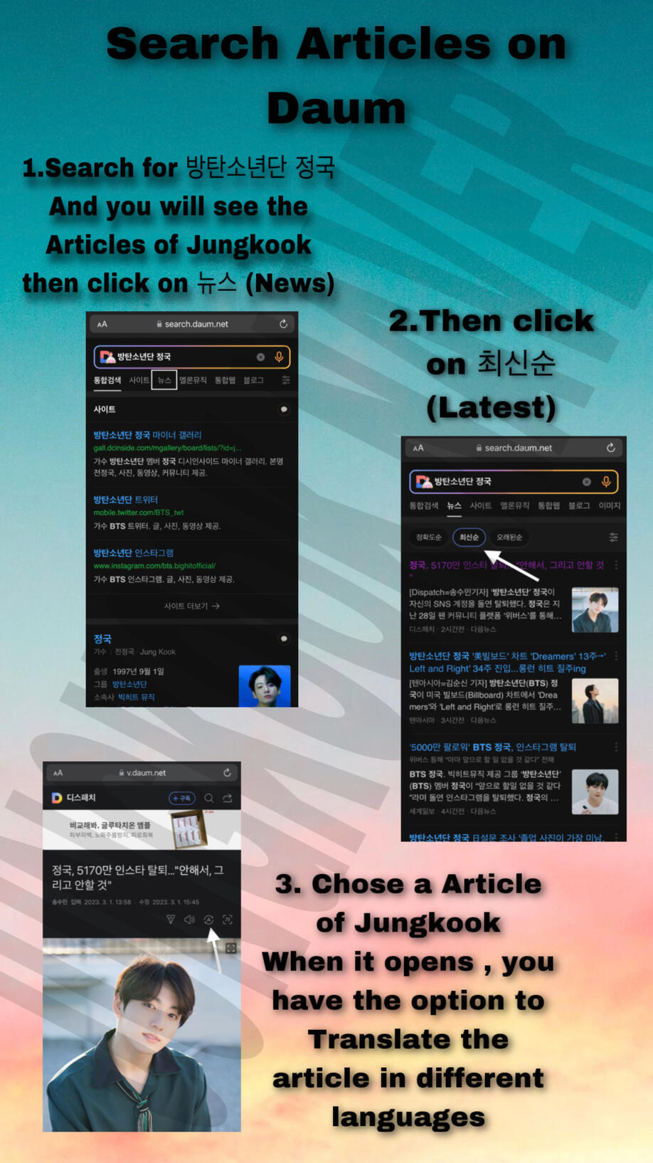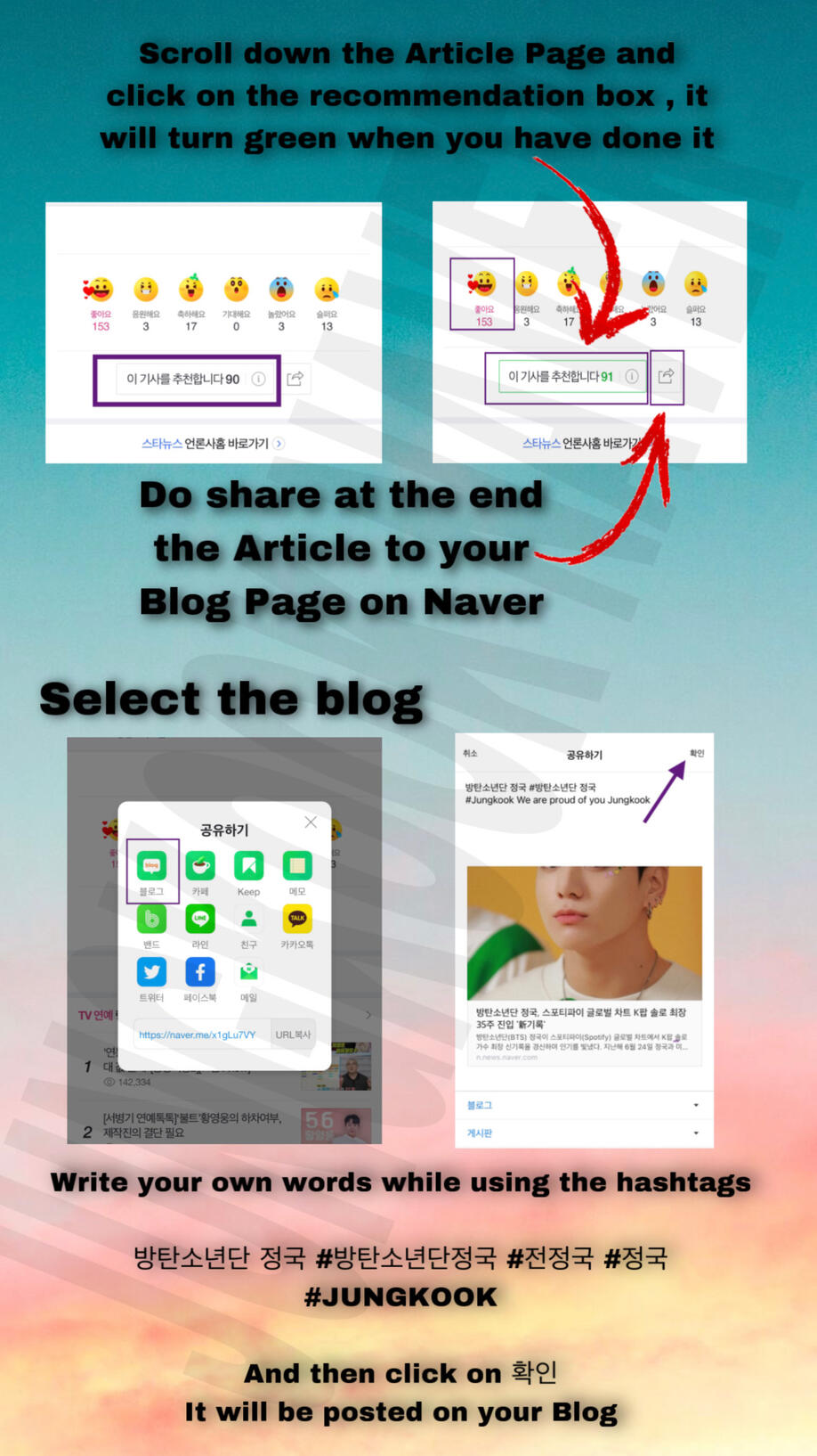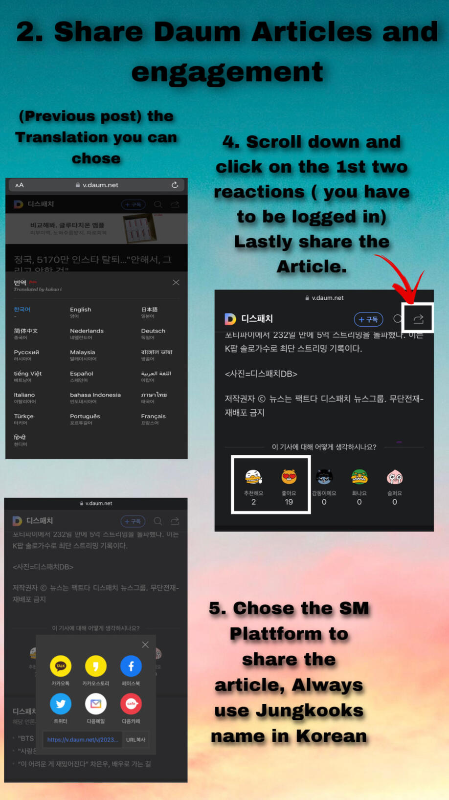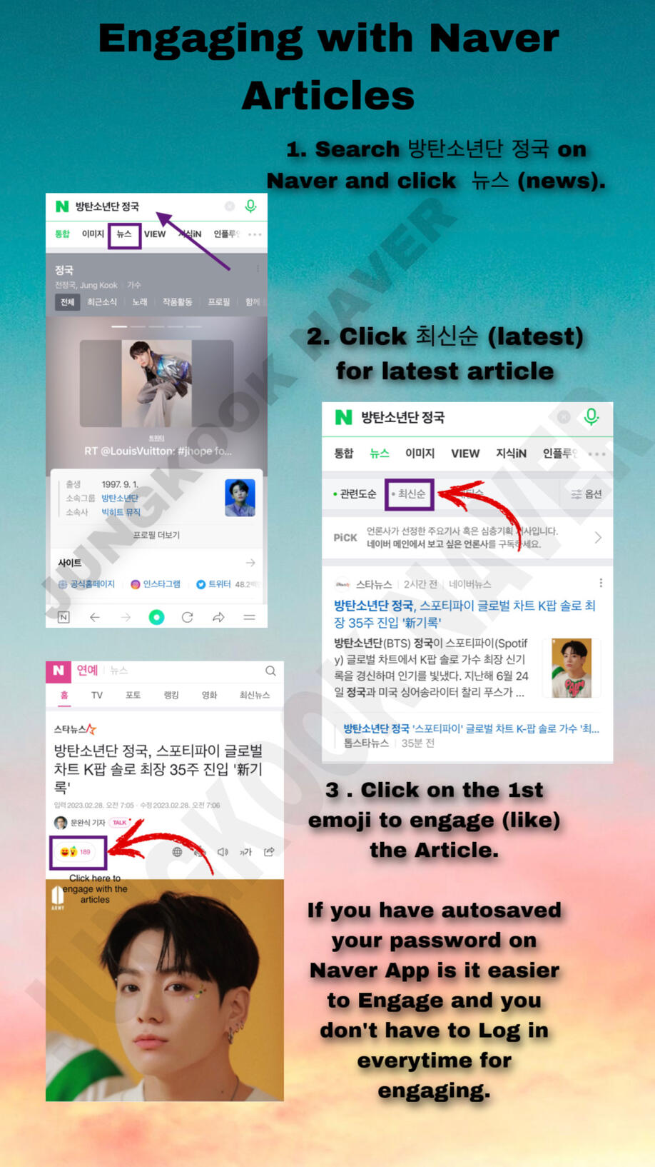 Its important to Engage and Like different Articles of K-Media also for non-naver articles ,the views are very important. So make sure to view the articles once and share them to SNS and always ad Hashtags and write Jungkook’s name in Korean 방탄소년단 .